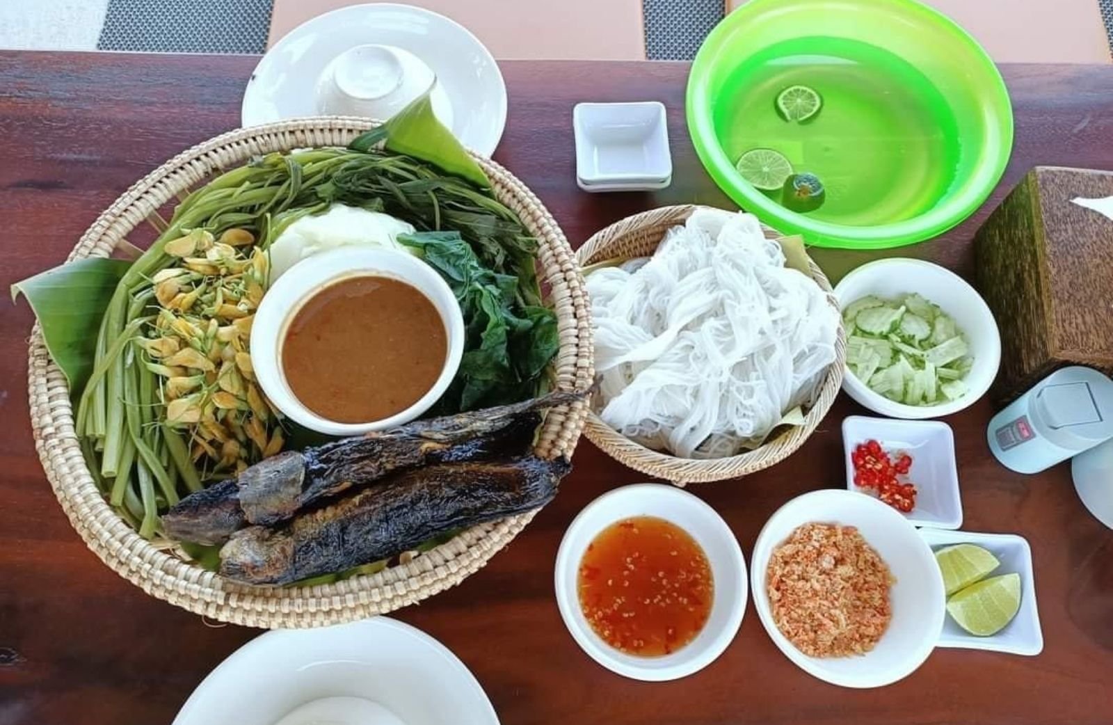ធ្លាប់លឺនំបញ្ចុកទឹកម្ហិច ចុះនំបញ្ចុកទឹកមុាំវិញធ្លាប់លឺអត់? នំបញ្ចុកនេះគេរៀបចំឡើងជាឈុត មាននំបញ្ចុក ត្រីអាំង បន្លែស្រុះ និងទឹកមុាំ រសជាតិក៏ឆ្ងាញ់ កន្លែងអង្គុយកាន់តែអេម នៅជិតស្រះទឹក បរិយាកាសល្អ ខ្យល់ត្រជាក់បែបធម្មជាតិ។